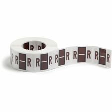 R - x 1 1/4" Width x 1" Length - Brown - Laminated - 500 / Roll. Convenient dispensing box for easy peel-off and application. Wraparound solid color bar with colored character on white background.