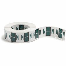 N - x 1 1/4" Width x 1" Length - Dark Green - Laminated - 500 / Roll. Convenient dispensing box for easy peel-off and application. Wraparound solid color bar with colored character on white background.