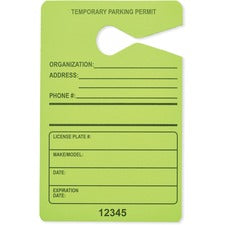 3.5" Width x 5.5" Height - Rectangular Shape - Hanging - Fluorescent Green - 50 / Pack. Hook top conveniently hangs from rear-view mirror. Separate space for organization name ensures quick identification.